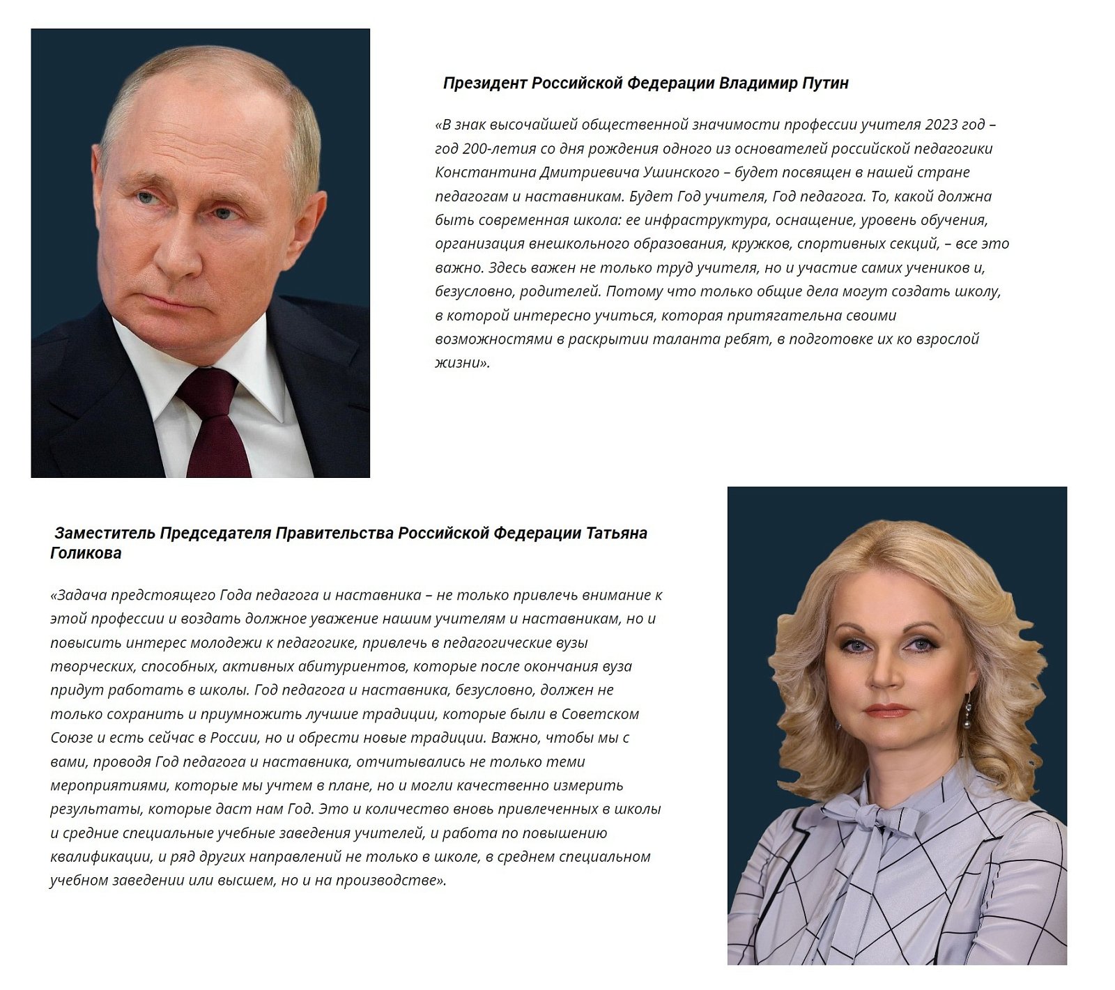 Указом Президента России Владимира Путина 2023 год объявлен Годом педагога и наставника. Миссия Года – признание особого статуса педагогических работников, в том числе выполняющих наставническую деятельность. Мероприятия Года педагога и наставника будут направлены на повышение престижа профессии учителя.