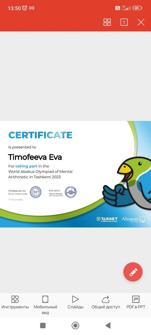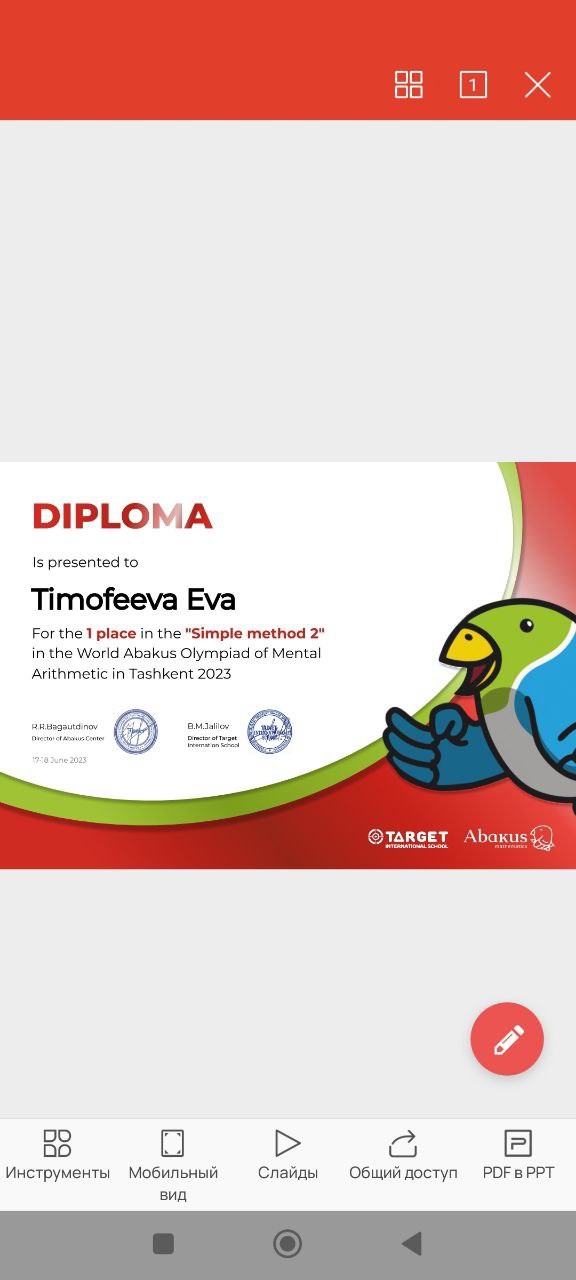Международной олимпиаде Абакус 2023 Ташкент, Узбекистан по ментальной арифметике???????? где заняла 1 место. Мы от всего коллектива поздравляем Еву с победой и желаем дальнейших больших побед!!!