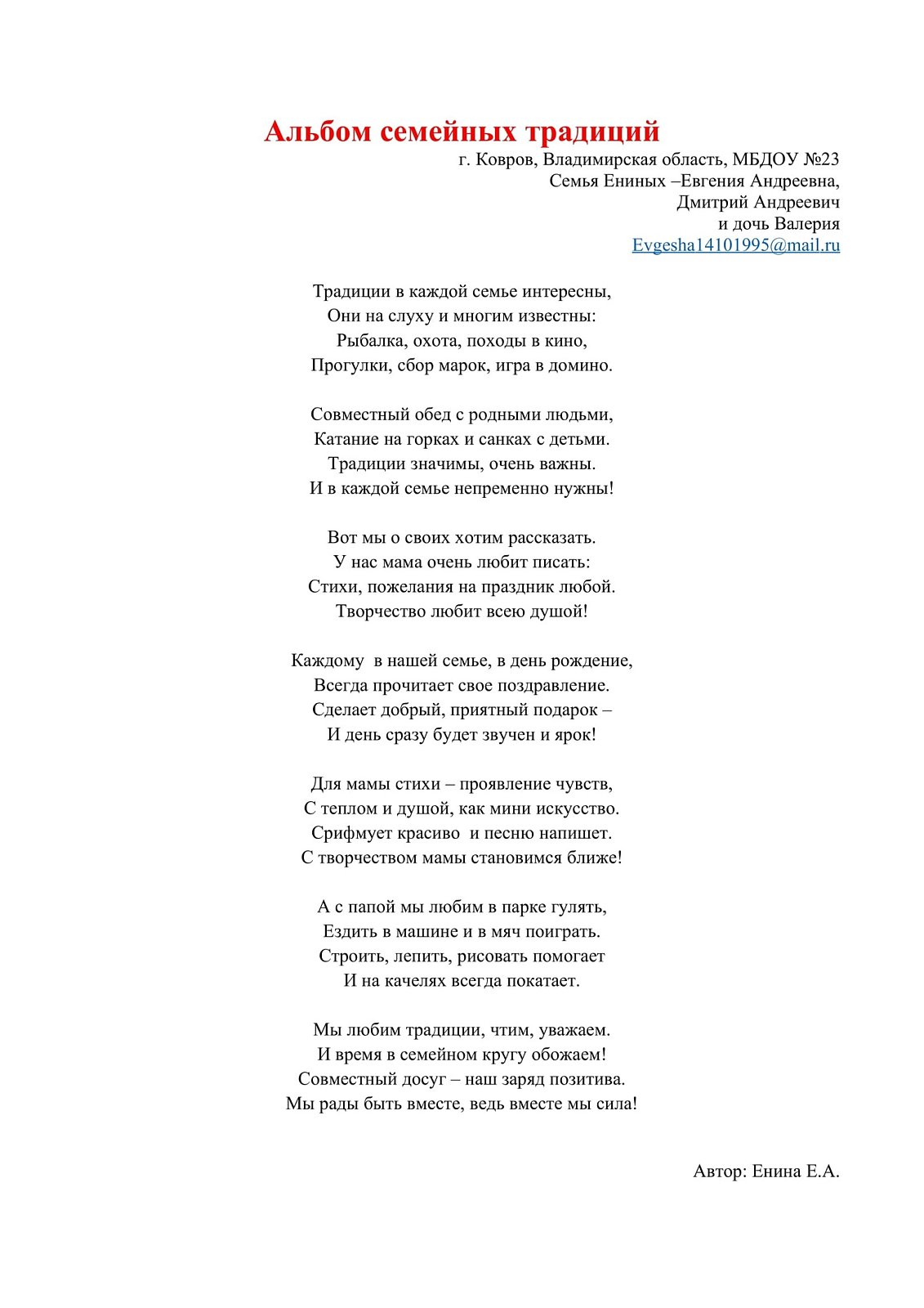 В рамках деятельности городского Ресурсного центра по проблеме: "Укрепление и пропаганда семейных ценностей в образовательном и социокультурном пространстве ДОУ" была проведена акция "Альбом семейных традиций". в данной акции приняли участие 42 семьи из 13 МДОУ города. от МБДОУ № 23 участвовала семья Ениных Евгения Андреевна, Дмитрий Андреевич и Валерия