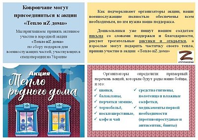 Наш детский садик № 23 продолжает активное участие в акции города Коврова "Тепло из дома" и мы уверены,что вместе с подарками наши бойцы получат частичку тепла из родного дома. Сейчас наши солдаты особенно нуждаются в поддержке, в теплых словах благодарности, внимании и любви.