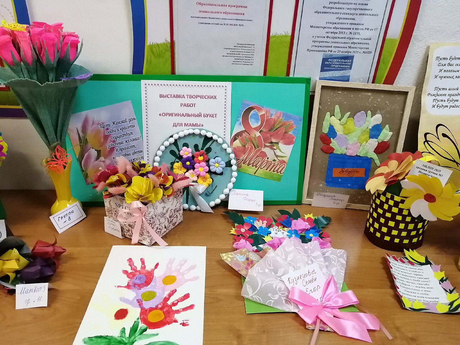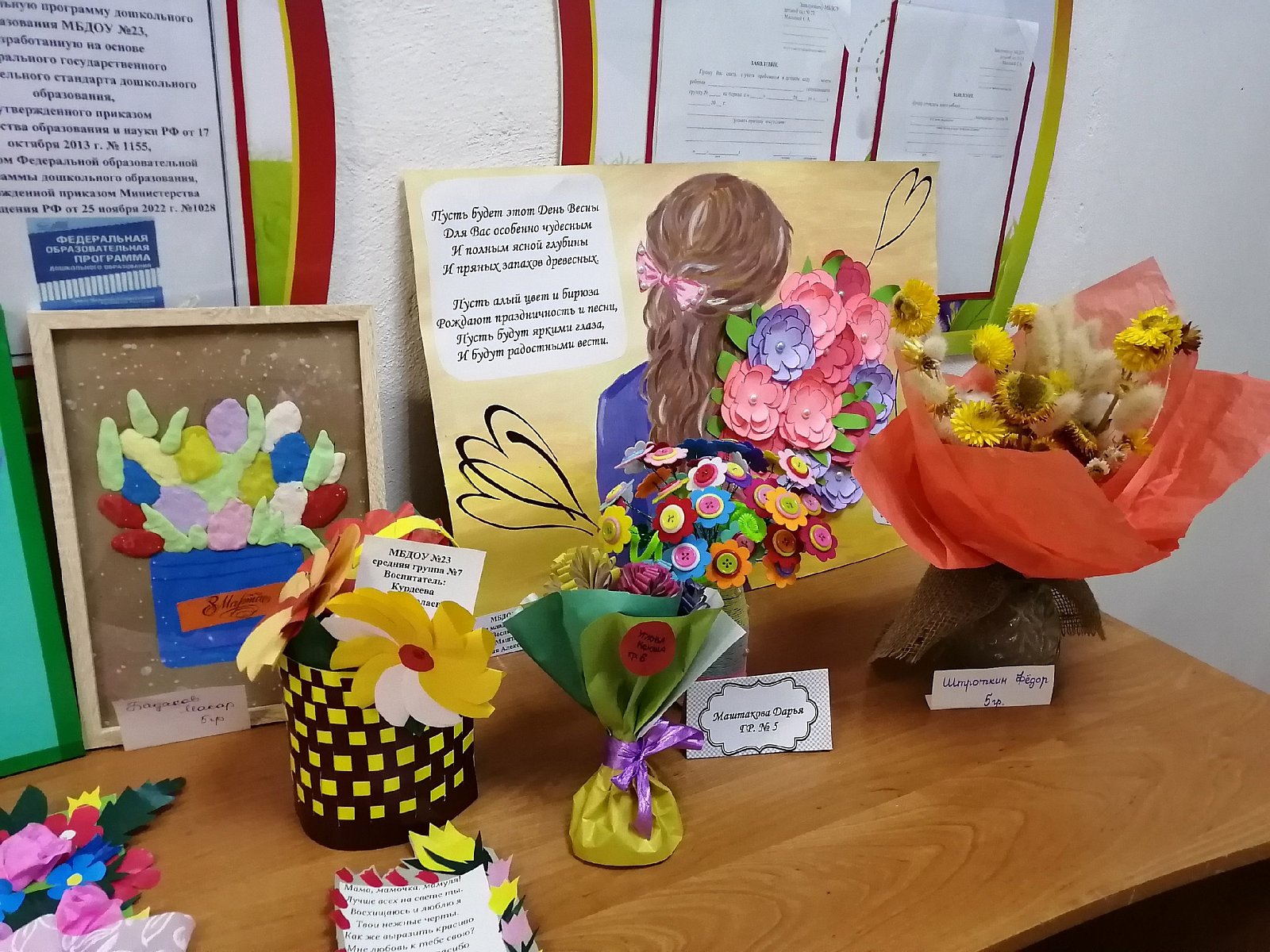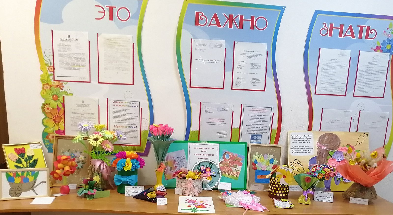 Поделки получились очень интересные, отражали тему праздника и создали весеннее настроение. Оказывается не так много надо, чтобы создать праздничное настроение. Материал, фантазия и немного творчества. Вот какие молодцы наши мамы, что находят время вместе с детьми заняться творчеством. А самое главное этому учатся и их дети. Большое спасибо родителям и нашим дошколятам за их труд!