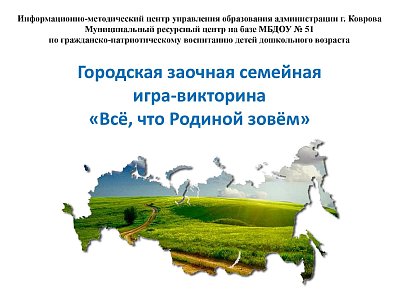 Сообщаем о проведении городской заочной своей семейной викторины "Всё, что Родиной зовём" . В мероприятии участвуют семьи дошкольников старших и подготовительных групп.