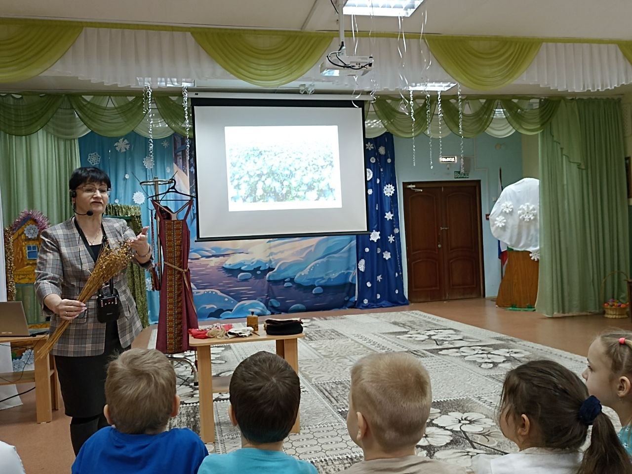 12 и 13 февраля состоялось тематическое занятие «Русский народный костюм» с детьми подготовительных групп №8,9,11. К ребятам в гости приходила сотрудник Музея природы и этнографии, заведующая этнографическим сектором, Прусова Ирина Михайловна.