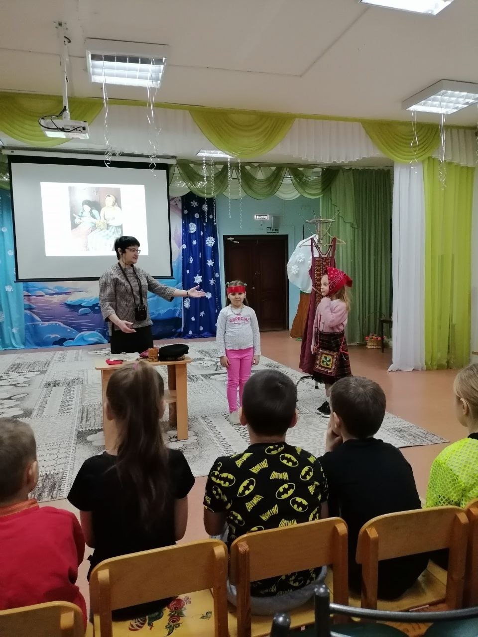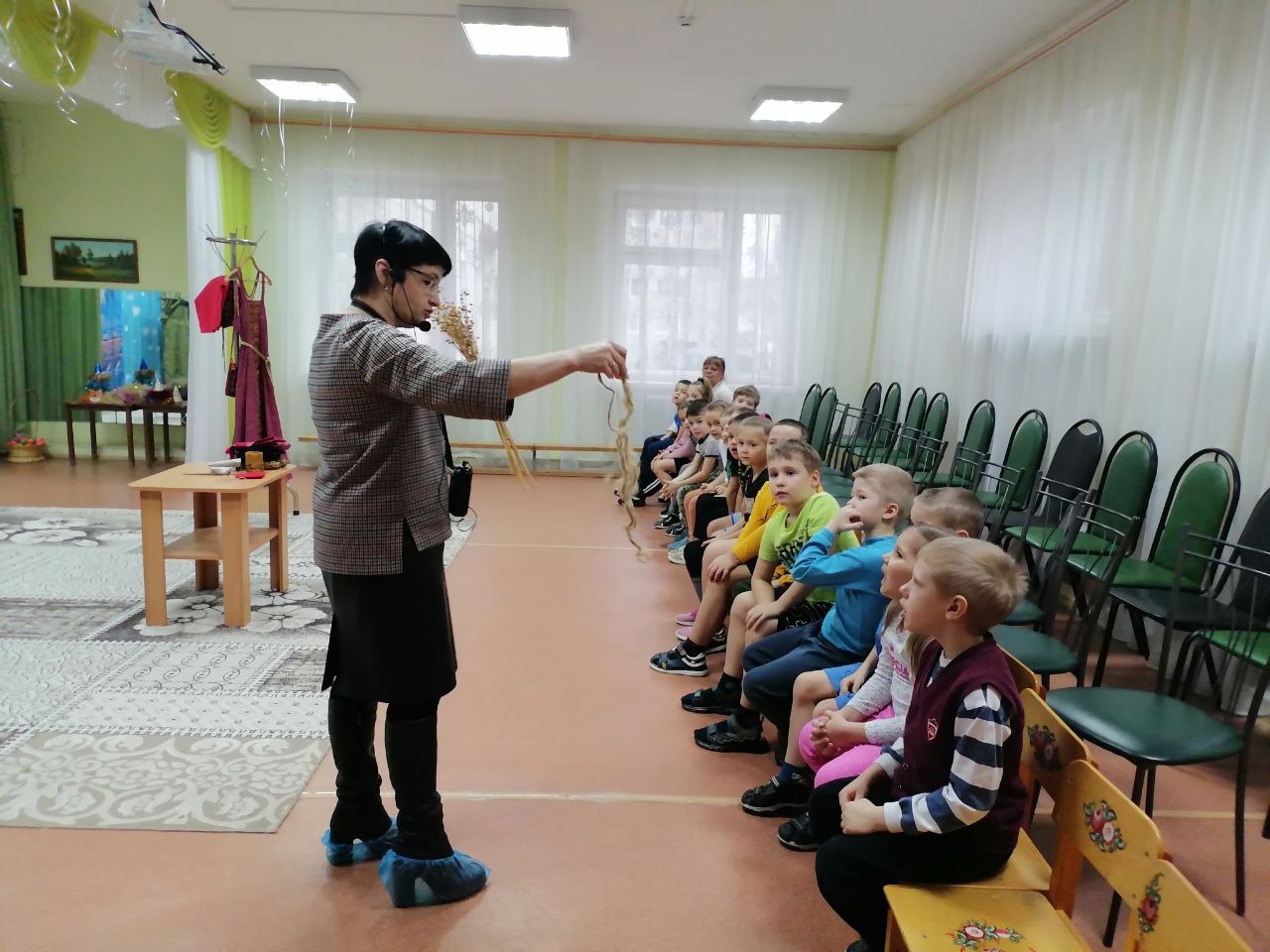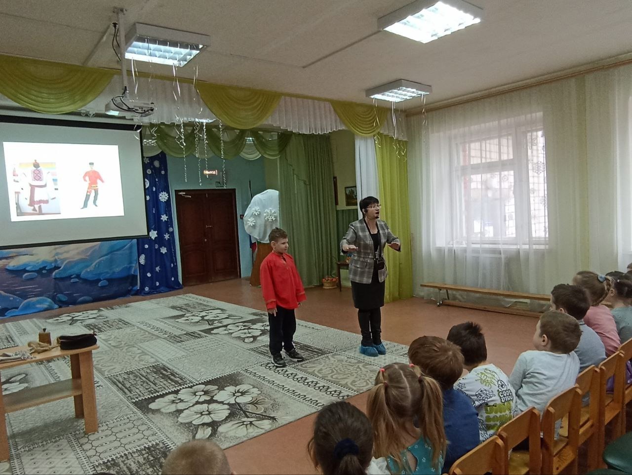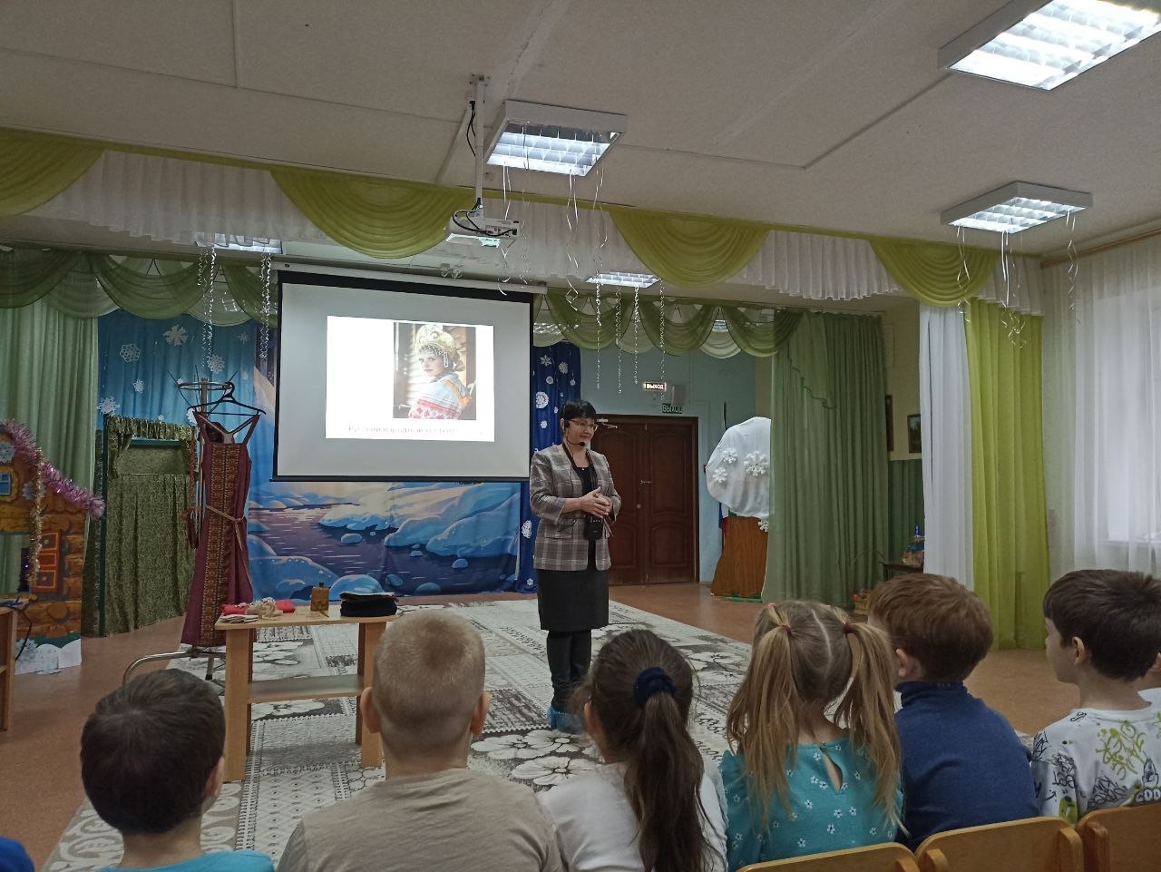 Ирина Михайловна в интерактивной форме рассказала об истории народного костюма, о тканях, об одежде мужчин и женщин, будничной и праздничной, прививая дошкольникам интерес к традиционной народной культуре. Ребята узнали о символике орнаментов, о различиях в костюмах разных губерний, о головных уборах и украшениях. Особое внимание было уделено материалам, из которых изготавливалась одежда: льну, шерсти, хлопку. Дошкольники с удовольствием рассматривали иллюстрации и отвечали на вопросы Ирины Михайловны, проявляя неподдельный интерес к теме. Занятие сопровождалось показом образцов ткани и элементов костюма, что позволило детям лучше прочувствовать атмосферу народной культуры. Было занимательно и интересно!!!