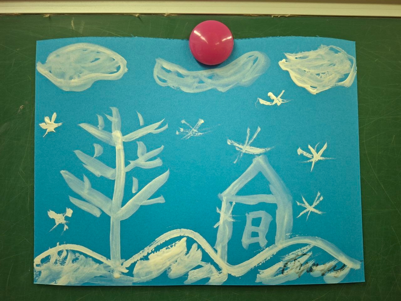 Каждый ребенок вложил в свой рисунок частичку своего зимнего настроения. На голубом фоне медленно рождались причудливые узоры - снежинки, деревья в инее, домики с заснеженными крышами.