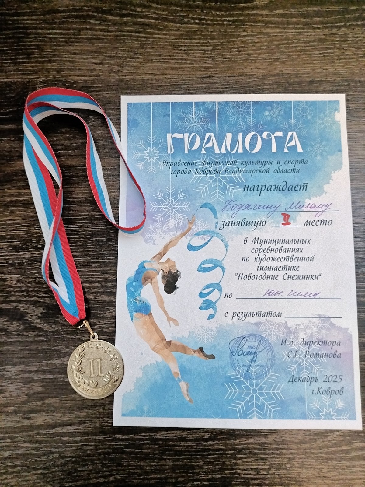 По итогам соревнований Бодягина Милана заняла почетное 2 место, уступив лишь немного своей опытной сопернице. Этот результат – заслуженная награда за ее упорный труд, настойчивость и преданность спорту. Мы поздравляем Милану с этой заслуженной победой и желаем ей дальнейших успехов и новых достижений в мире художественной гимнастики. Мы уверены, что ее талант и трудолюбие помогут ей достичь еще больших высот!